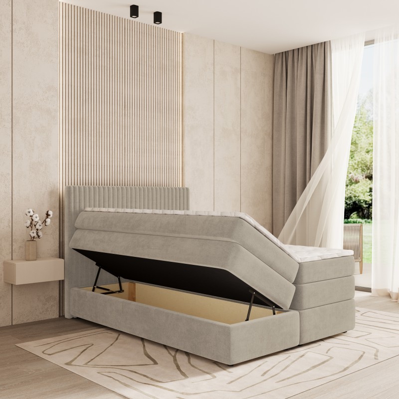 - Ergonomischer Schlafkomfort - Das Boxspringbett wurde mit dem Ziel entworfen, maximalen Komfort und optimale Unterstützung für den Körper zu bieten. Es verfügt über eine Doppelschicht-Matratze mit dem universellsten Härtegrad. Die mit der Basis verbundene Bonellfederkernmatratze sowie eine zusätzliche Taschenfederkernmatratze sorgen für Stabilität, erhöhten Komfort und perfekte Unterstützung in jeder Körperzone. Diese ideale Kombination ermöglicht eine korrekte Ausrichtung der Wirbelsäule während des Schlafs und unvergleichlichen Liegekomfort. Die solide Konstruktion gewährleistet Langlebigkeit und Stabilität, sodass jede Nacht nicht nur bequem, sondern auch vollkommen erholsam ist.