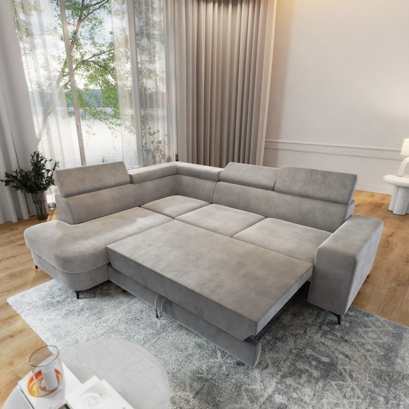 Masseno Ecksofa ALVORO mit Schlaffunktion und Bettkasten, Ausziehbares Bettsofa - Hellgrau, MONOLITH 84