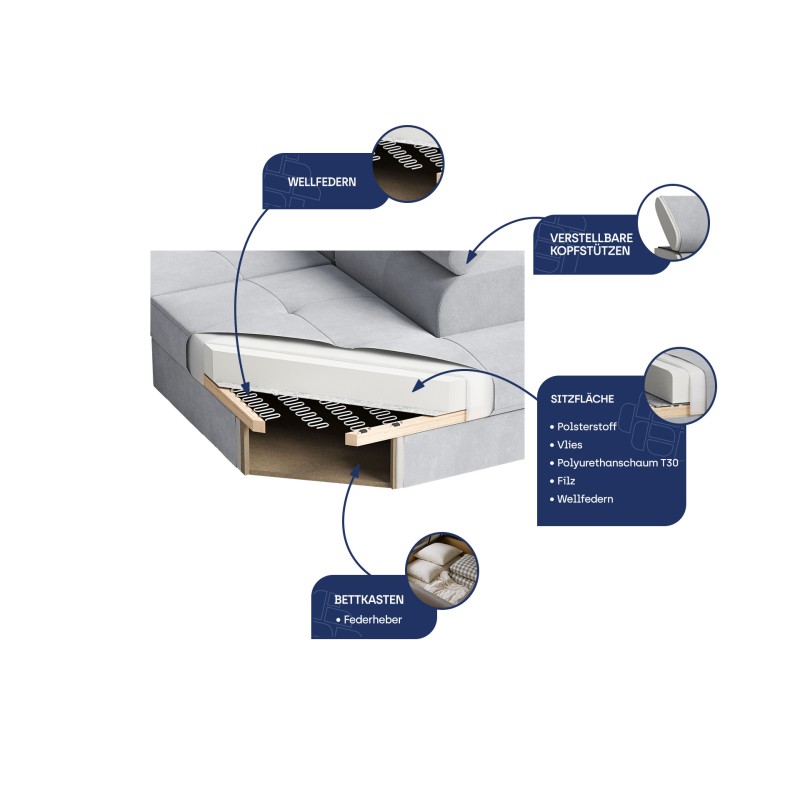 - Das Ecksofa ist mit einer 5-fach verstellbaren Kopfstütze ausgestattet, die es ermöglicht, den Neigungswinkel individuell an deine Bedürfnisse anzupassen. So genießt du maximalen Komfort – beim Lesen, Fernsehen oder Entspannen nach einem langen Tag.