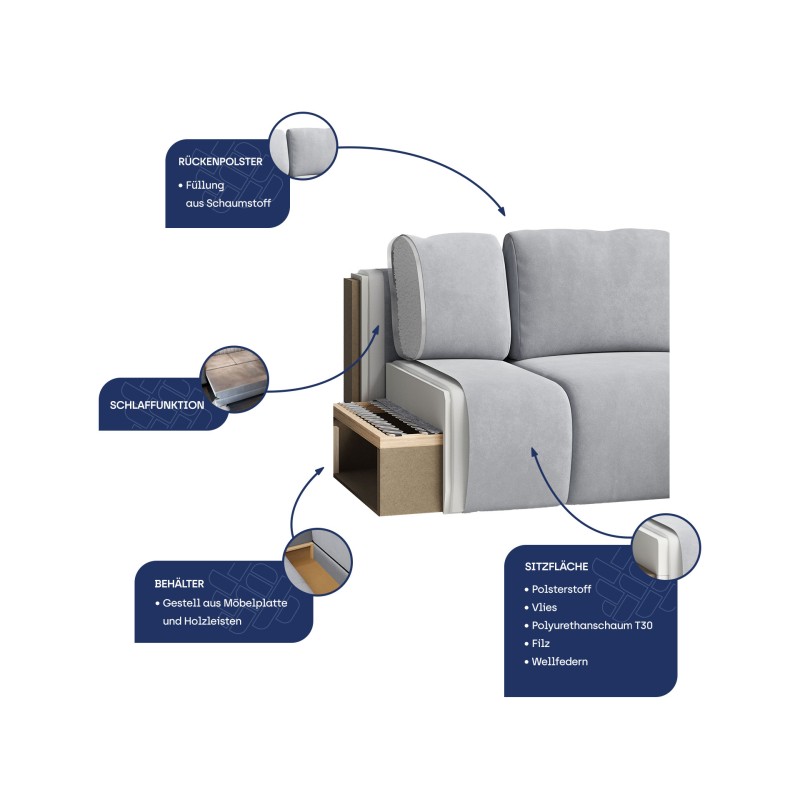 Masseno Ecksofa SAVONA mit Schlaffunktion und Bettkasten, Ausziehbares Bettsofa - Hellgrau, POSO 55