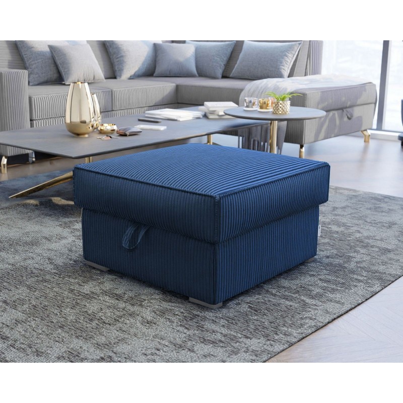 Bequemer Hocker FERA mit Staufach, bezogen mit POSO-Cordstoff in Blau