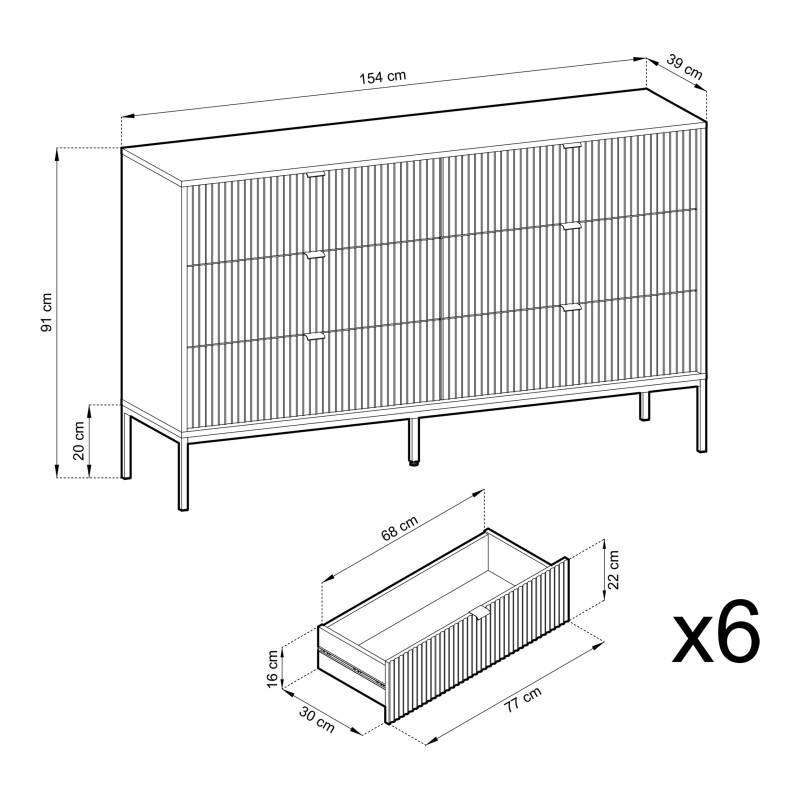 Masseno Kommode STELLARE 154 cm Sideboard mit 6 Schubladen für Wohnzimmer Schlafzimmer Modern 154x39x91 cm Schwarz / Schwarz