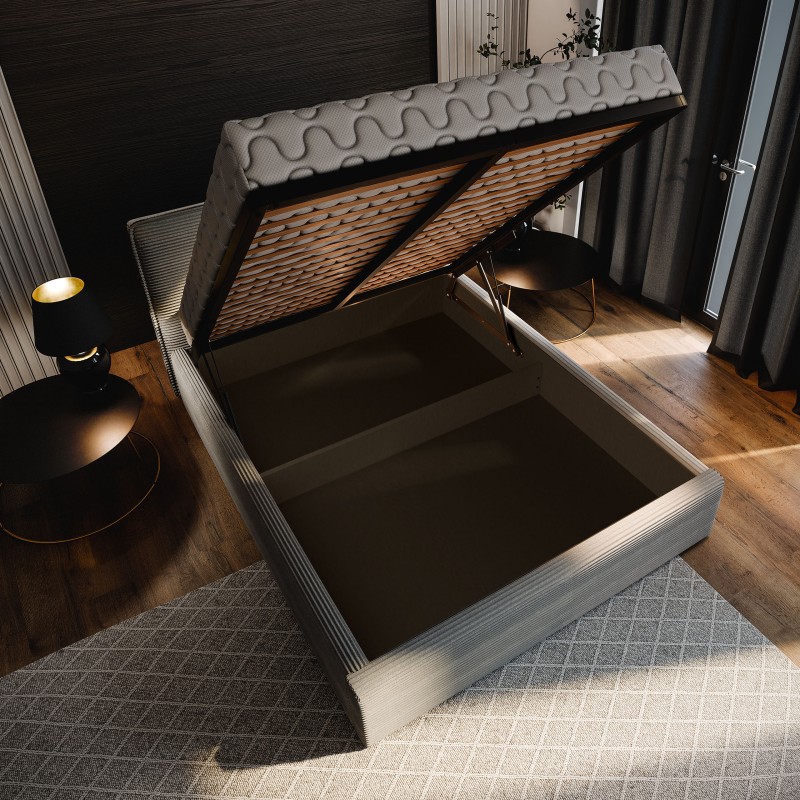 Jedes Detail – vom weichen Bezugsstoff bis zur sorgfältigen Verarbeitung – ist darauf ausgelegt, Ihnen Nacht für Nacht tiefen, erholsamen Schlaf und ein Gefühl von Luxus zu schenken. Nutzen Sie das volle Potenzial Ihres Schlafzimmers dank praktischer Stauraumlösungen. Das Bett ist mit einem aufklappbaren Lattenrost ausgestattet, der von einem zuverlässigen Mechanismus unterstützt wird. Dadurch ist der Zugang zum geräumigen Bettkasten absolut mühelos und komfortabel.