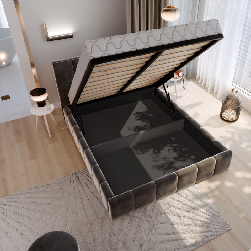 Jedes Detail – vom weichen Bezugsstoff bis zur sorgfältigen Verarbeitung – ist darauf ausgelegt, Ihnen Nacht für Nacht tiefen, erholsamen Schlaf und ein Gefühl von Luxus zu schenken. Nutzen Sie das volle Potenzial Ihres Schlafzimmers dank praktischer Stauraumlösungen. Das Bett ist mit einem aufklappbaren Lattenrost ausgestattet, der von einem zuverlässigen Mechanismus unterstützt wird. Dadurch ist der Zugang zum geräumigen Bettkasten absolut mühelos und komfortabel.