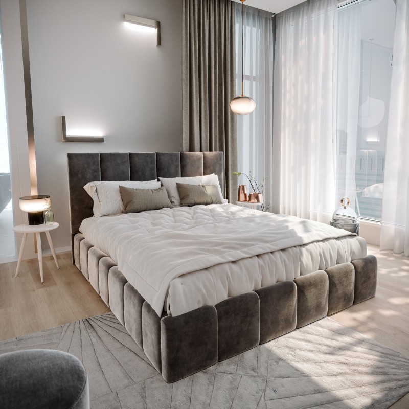 Das Polsterbett TARANTO ist die perfekte Verbindung aus modernem Design und durchdachter Funktionalität. Seine markante, aber harmonische Form wird sofort zum Mittelpunkt Ihres Schlafzimmers und erhöht dessen ästhetischen Standard. Dieses Möbelstück wurde für alle kreiert, die zeitlose Eleganz schätzen und ihr Schlafzimmer in eine Oase der Ruhe und des guten Geschmacks verwandeln möchten.