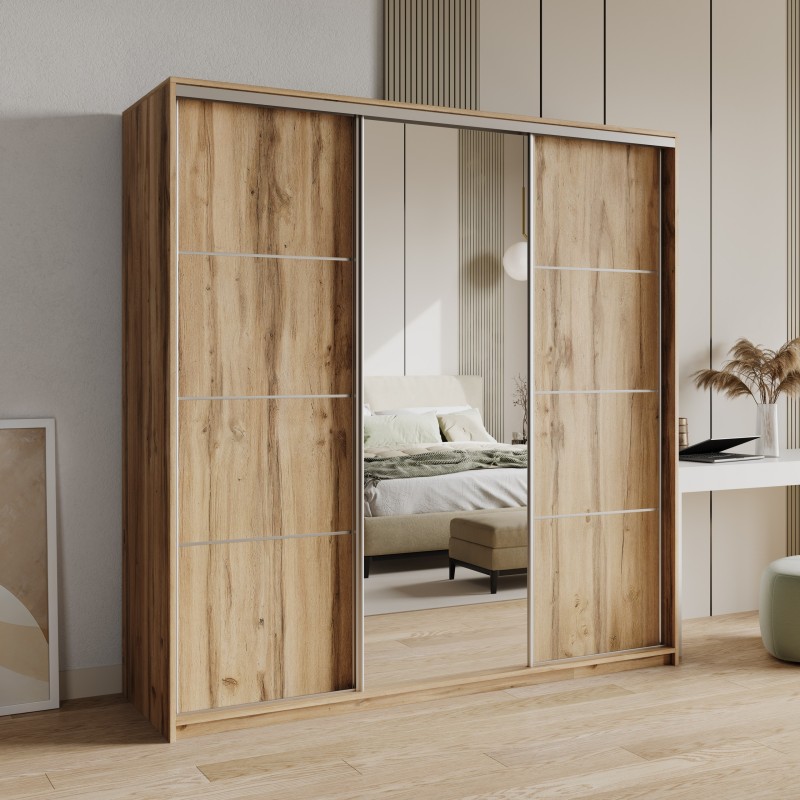 Masseno Schiebetürenschrank VARO 180/205/60cm 3-türig mit Spiegel Eiche Wotan